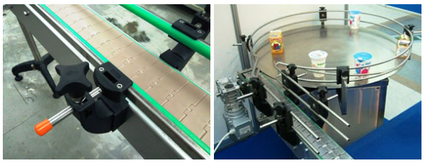 состоят из приводной, промежуточной и концевой секций прямых или поворотных, пластинчатой цепи, телескопических опор. Длина конвейера обеспечивается определенным количеством установленных промежуточных секций. Телескопические опоры позволяют плавно регулировать высоту транспортирования, облегчая стыковку с другим технологическим оборудованием. Тара ориентируется боковыми направляющими.