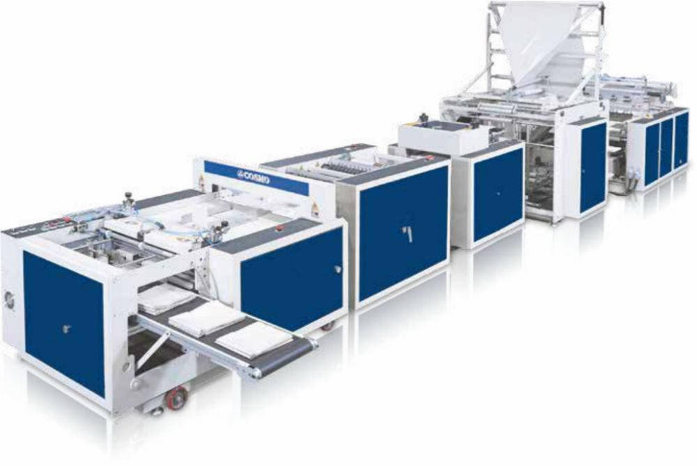 Партнеры компании представили новинку - полностью автоматическую машину для производства мусорных пакетов с подворотом 4 раза для пакетов S типа с донным швом, модель – SOSR-1300+2T+S+2F.