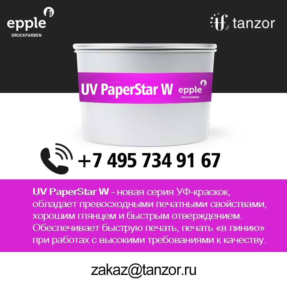 ГК «Танзор» рекомендует новую серию красок УФ-отверждения UV PAPERSTAR W (производство «epple druckfarben»).