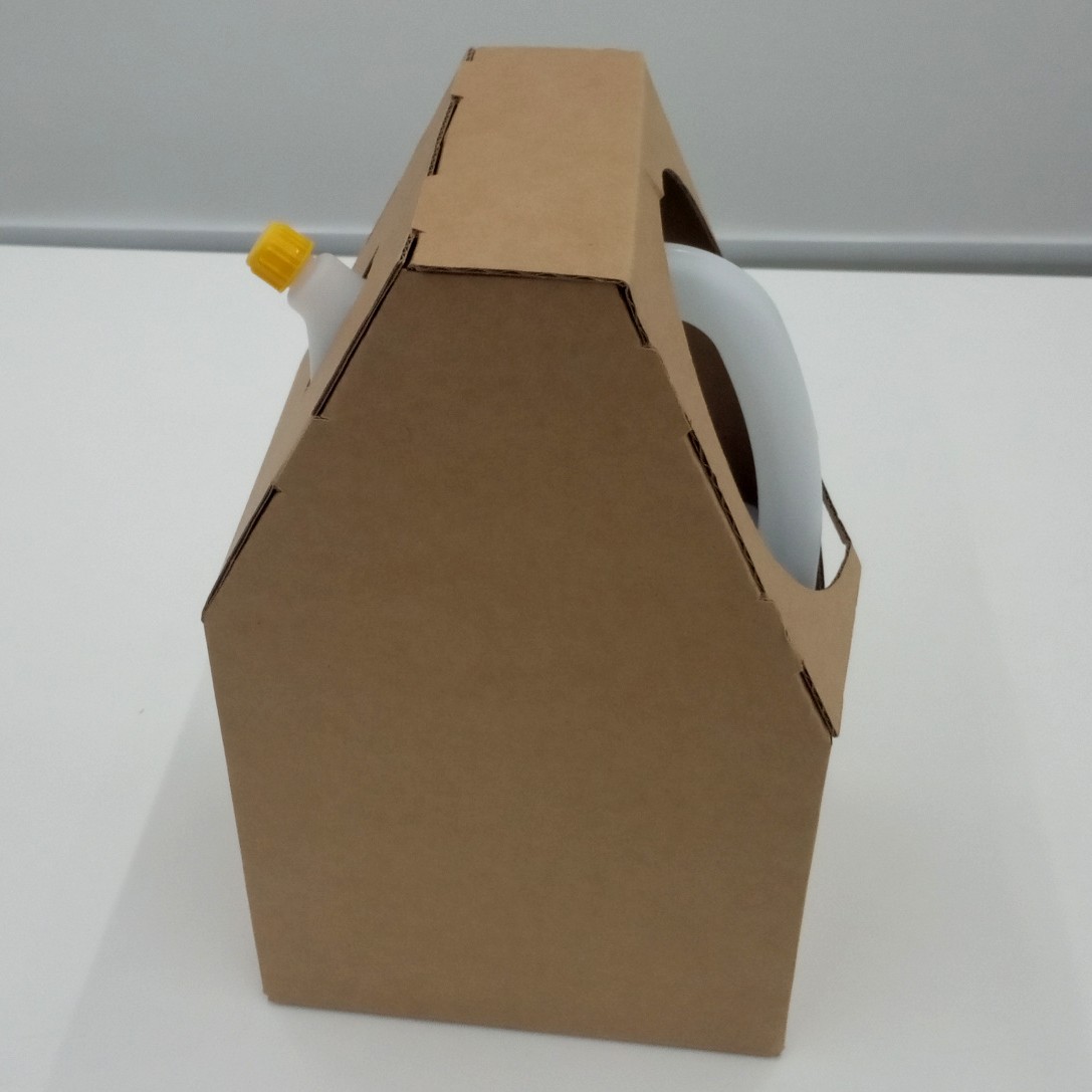 Верхняя часть коробки сконструирована таким образом, что на крышке остаются отверстия для ручки и носика канистры. Поварам и домохозяйкам будет удобно пользоваться такой оригинальной канистрой с маслом.