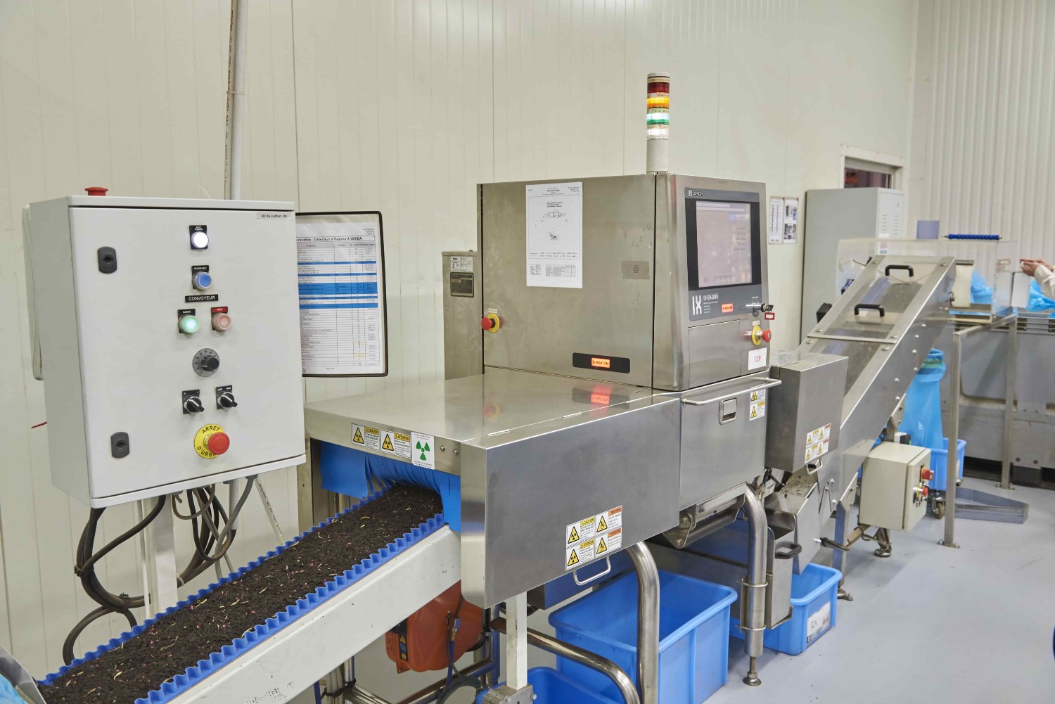 В начале каждого производственного цикла машина проходит процесс настройки путем пропускания через нее калибровочных образцов из металла, резины и стекла. Любые инородные тела обнаруживаются путем измерения плотности проверяемого продукта.