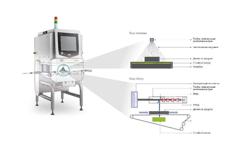 Рентгеновский луч проецируется на линейный датчик под конвейером. Когда он проходит через продукт, датчика достигает только остаточное излучение. Измерение разницы в уровне поглощения энергии рентгеновского излучения между сырьем и посторонними включениями позволяет эффективно их обнаруживать.