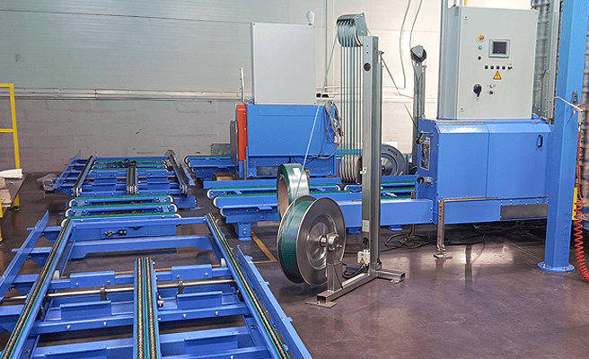 - Три рамы для автоматической вертикальной обвязки палет полимерными лентами;