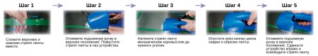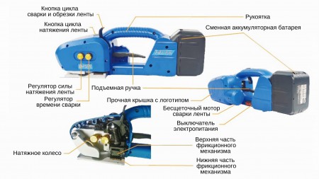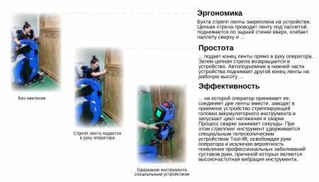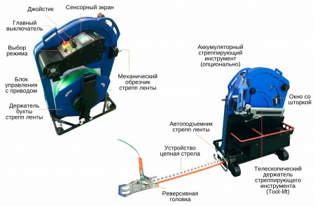 При этом сам аккумуляторный стреппирующий инструмент не является неотъемлемой частью комплекта, соединяется с держателем специальным кронштейном и может быть выбран оператором по своему усмотрению, в зависимости от предпочтений, исходя из особенностей упаковочной задачи или характеристик стрепп ленты.
