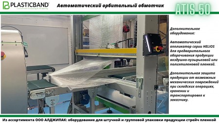 Иногда использование для упаковки одной только стрейч пленки недостаточно для полной и гарантированной защиты продукции при транспортировке. В таких случаях обычно используется двухкомпонентная защита, а именно: продукция предварительно оборачивается воздушно-пузырьковой пленкой, полиэтиленом или вспененным материалом, и только потом обматывается стрейч пленкой в орбитальном обмотчике. Компанией Plasticband для решения задачи предварительной упаковки продукции создана линейка специальных машин – аппликаторов серии HELIOS. Принцип работы аппликатора и согласование его работы с автоматическим орбитальным обмотчиком ATIS 50 хорошо показаны на видео ниже.