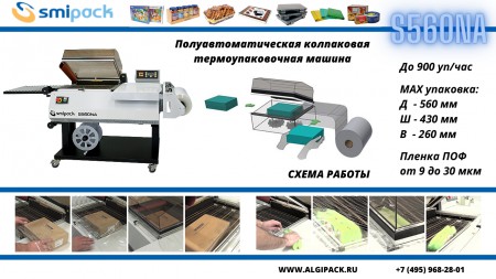 Модель Smipack FP560A имеет в своем составе два технологических узла. Это полуавтоматический угловой термонож с ленточным конвейером и электрический однозонный термотоннель. Работу упаковочной машины обеспечивает команда из два операторов и одного грузчика. Функционально работа команды раскладывается так: