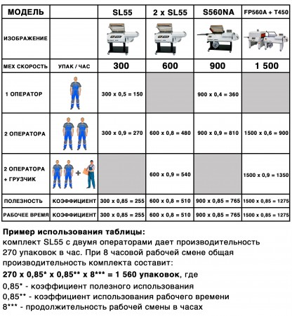 При обеспечении определенных условий, содержащих количество привлеченных к работе сотрудников, организацию процесса, а также характеристики продукции и упаковочного материала, единовременно или на короткий промежуток времени можно достичь заявленных изготовителем показателей максимальной производительности оборудования. Но для расчета и построения системы, которая стабильно обеспечит ежедневную требуемую производительность, к заводским характеристикам необходимо применить поправочные понижающие коэффициенты. Таблица расчетов предлагается Вашему вниманию: