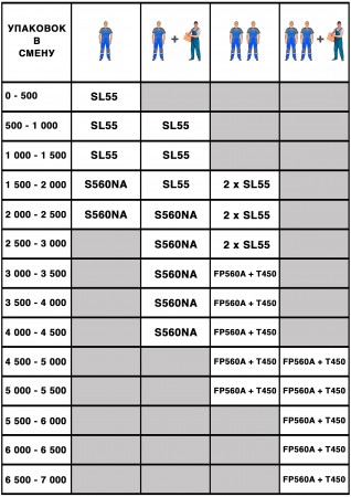 Ниже мы приведем для Вас еще одну таблицу, которая позволит Вам спланировать оснащение участка упаковки продукции в термоусадочную пленку на базе ручных и полуавтоматических упаковочных машин Smipack в привязке к требуемой средней производительности. Эта таблица также сформирована нами в результате многолетних наблюдений и анализа эксплуатации оборудования Smipack нашими заказчиками. Цифры в таблице носят рекомендательных характер, но знайте, что эти рекомендации уже оплачены опытом наших клиентов.