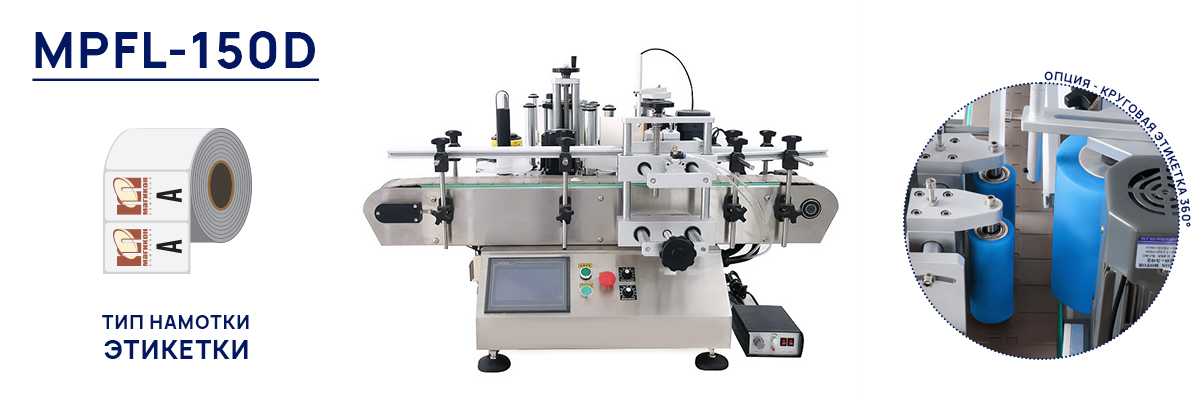 Этикетировщик автоматический для круглых бутылок . Так же, как и его предшественник , данный этикетировщик имеет термопринтер нанесения даты на этикетку. Отличительной особенностью данной модели в возможности наносить на круговую тару полную круговую этикетку - 360°!