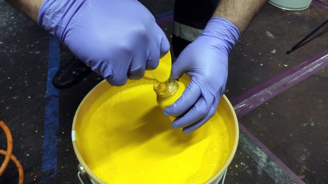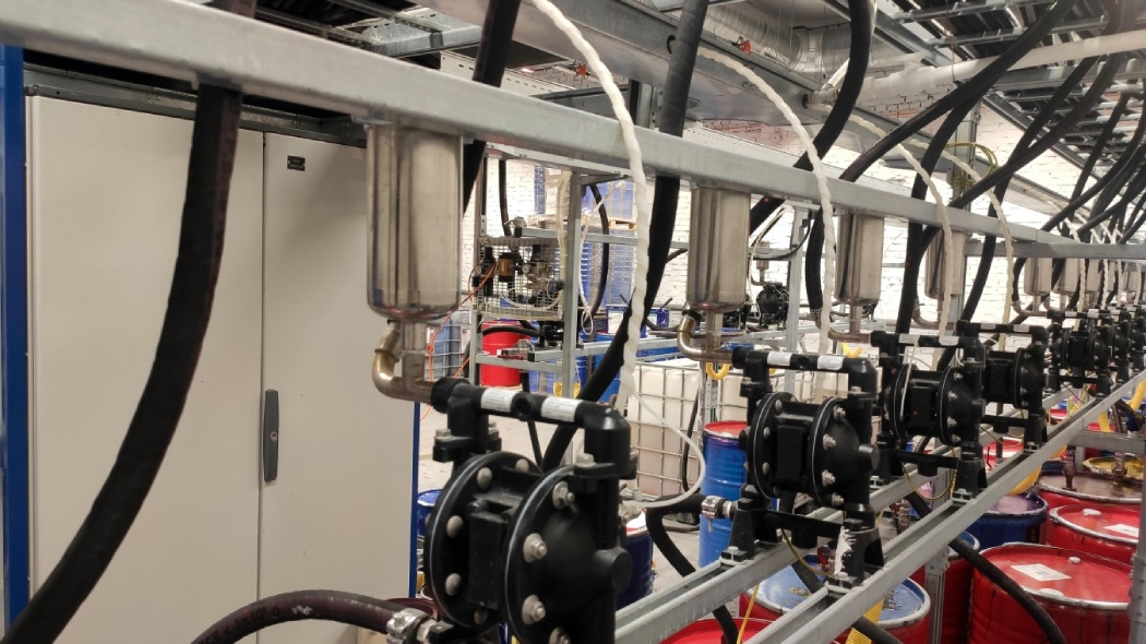Процесс производства красок автоматизирован. Дозирование компонентов и их смешение выполняется на специализированном оборудовании. Установленная станция смешения INKMAKER (Италия) оснащена многоступенчатыми дозирующими клапанами и пневматическими насосами с гасителями пульсаций. Точный контроль расхода компонентов позволяет изготавливать краски в полном соответствии с рецептурами. Заказы от нескольких до сотен килограммов краски производятся экономично и быстро.