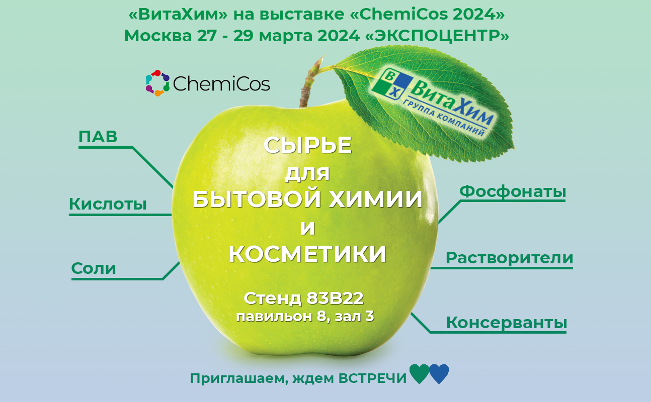 Группа компаний «ВитаХим®» примет участие в международной специализированной выставке химического сырья и ингредиентов для производства профессиональной химии, бытовой химии, косметики, парфюмерии, упаковки «ChemiCos Industry 2024», которая будет проходить в Москве 27-29 марта 2024 г. ЦВК «Экспоцентр».