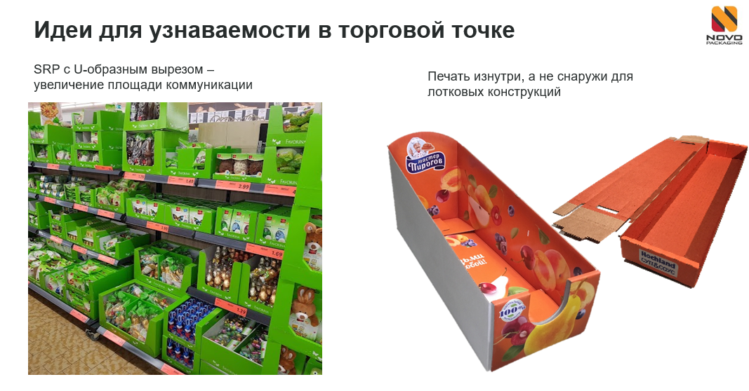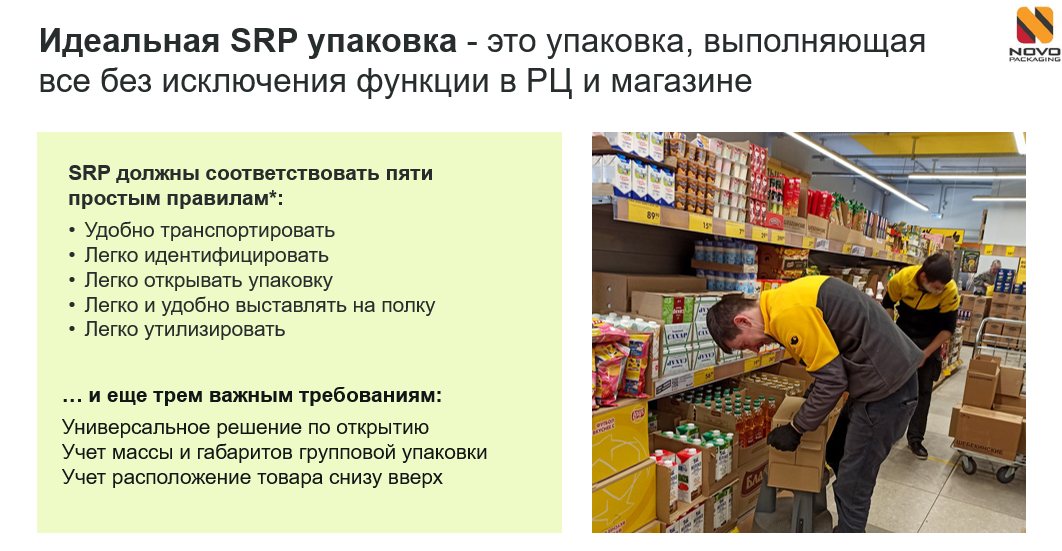 Несмотря на разницу в подходах развития сетей различных форматов, а также особенностей стандартов упаковки, общим вектором остается обоснованная потребность в SRP решениях (SRP, Shelf Ready Packaging, упаковка с товаром, готовая к выкладке на полку) способных эффективно группировать и правильно формировать товар внутри полочного пространства, а также снижать операционные издержки и являться эффективным маркетинговым инструментом.
