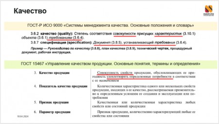 Что же такое качество? ISO 9001 формулирует качество как совокупность характеристик продукта, которые должны соответствовать определенным требованиям. ГОСТ 16567 подтверждает данный постулат, говоря о том, что качество это совокупность свойств продукта, удовлетворяющих определенным потребностям в соответствии с назначением. Требования по качеству, как правило, в обязательном порядке формализуются и регламентируются, что подтверждается требованиями ISO 9001.