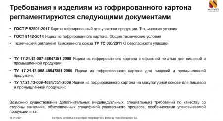 Требования к продукции описываются в определенных нормативных документах. Основные документы, которые применимы к гофропродукции – это ГОСТ 52901 (картон гофрированный), ГОСТ 9142 (ящики из гофрированного картона), тех. регламент таможенного союза ТР ТС 005/2011, а также требования могут быть описаны в технических условиях производителей упаковки и отдельно сформулированы заказчиками.