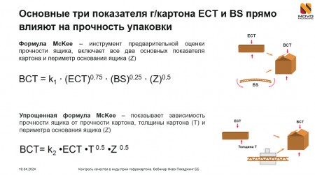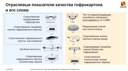 Одним из познавательных моментов вебинара явилось проведение в лаборатории качества Ново Пакаджинг ББ в онлайн формате измерений образцов материалов по ключевым параметрам, определяющим качество готового продукта: сопротивление продавливанию гофрокартона (Mullen), изгибная жесткость (BS), сопротивление торцевому сжатию гофрокартона (ECT), сопротивление ящика сжатию (BCT).