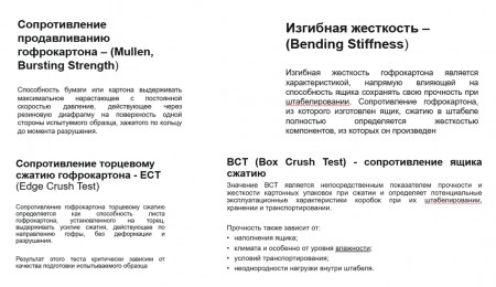Для обеспечения сопоставимости результатов испытаний все тесты прочностных свойств гофрокартона и ящиков проводятся после предварительного кондиционирования образцов при температуре воздуха 23°С и относительной влажности 50%.