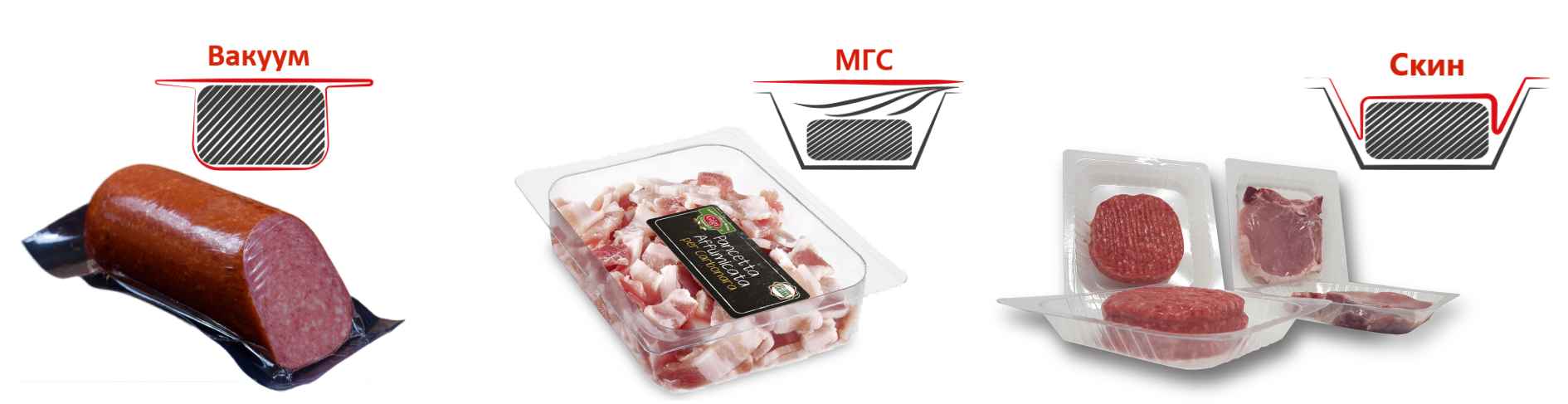 Существует три основные технологии упаковки продукта на термоформере: вакуум, газомодифицированная среда и «скин» (от англ. «skin» -кожа).