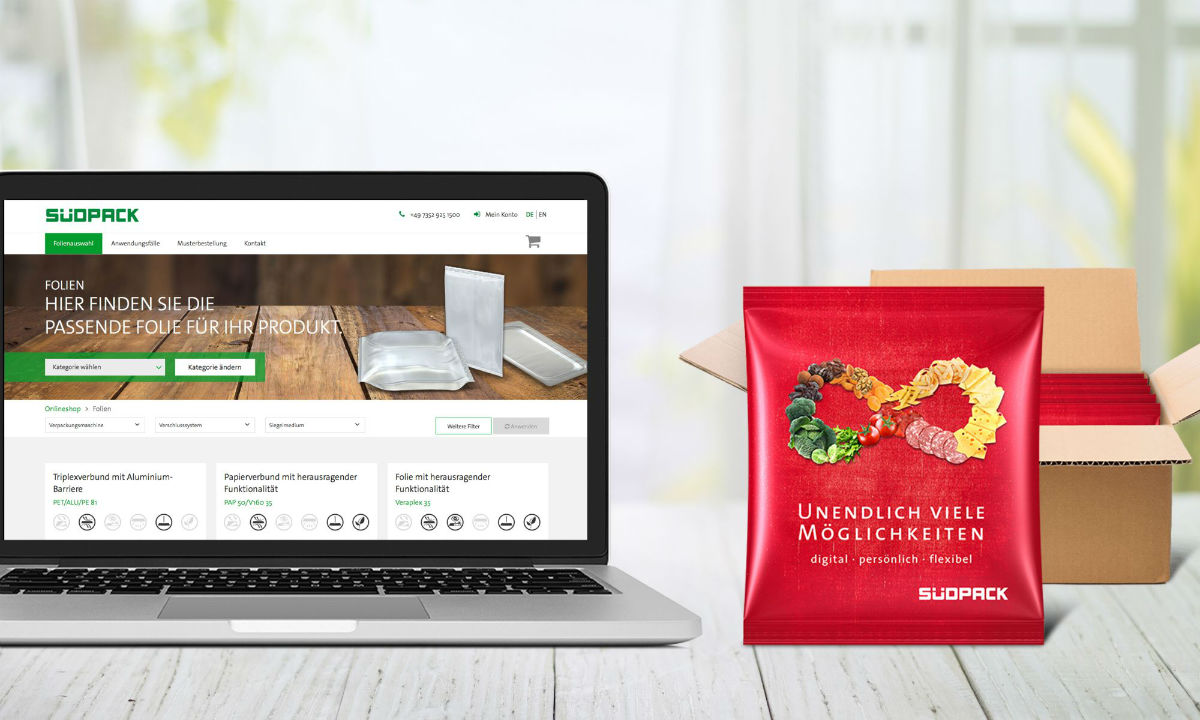 Online shop users receive step-by-step guidance in choosing the best solution for their product, just as they would in face-to-face consultation with Südpack specialists. A configurator recommends films that suit the specific application. Along with maximum product safety, the aim is to achieve the best possible product experience for consumers. Additional functions can be selected in the shop. Once the customer has chosen a particular film solution, they upload their printing data with parameters and template. Film details are configured in the final step. Printed films can also be ordered with express delivery.