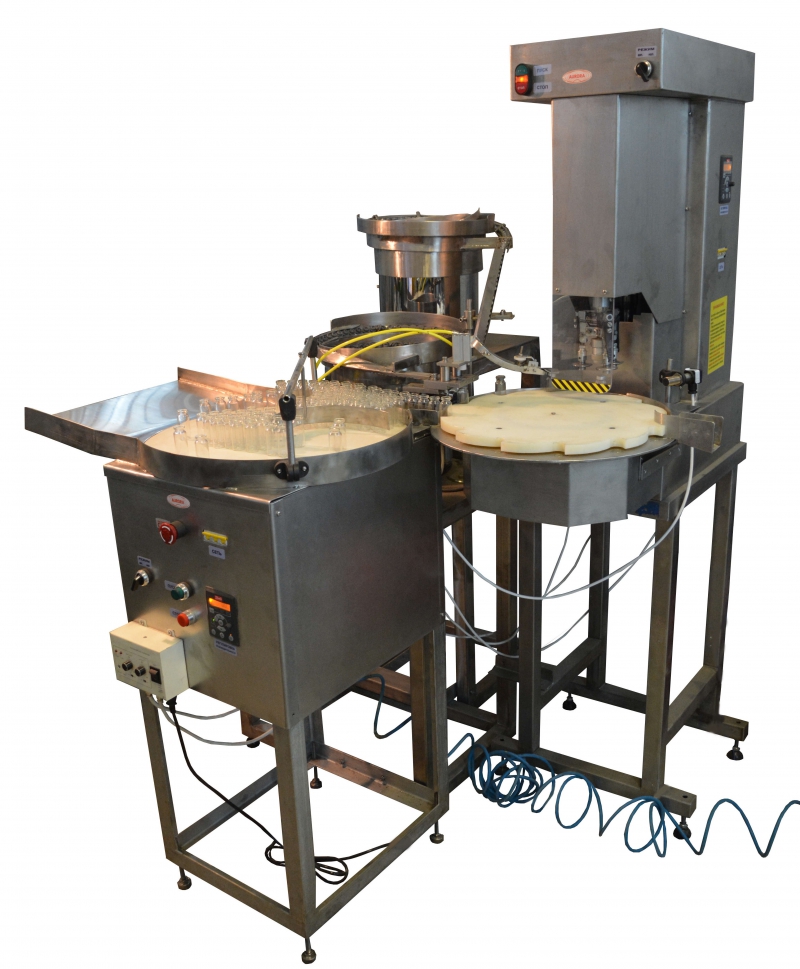 Наполненные продуктом флаконы с промежуточного накопительного поворотного стола направляются в паз 12-ти позиционной капролоновой звездочки, которая исключает повреждения тары. После этого флакон поступает в зону автоматического ориентирования резиновой пробки и алюминиевого колпачка, либо эти операции выполняются вручную. В зоне закатки возвратно-поступательными движениями укупорочной головки происходит завальцовка алюминиевого колпачка, после чего тара перемещается на выходной накопительный стол, откуда ее забирает оператор.