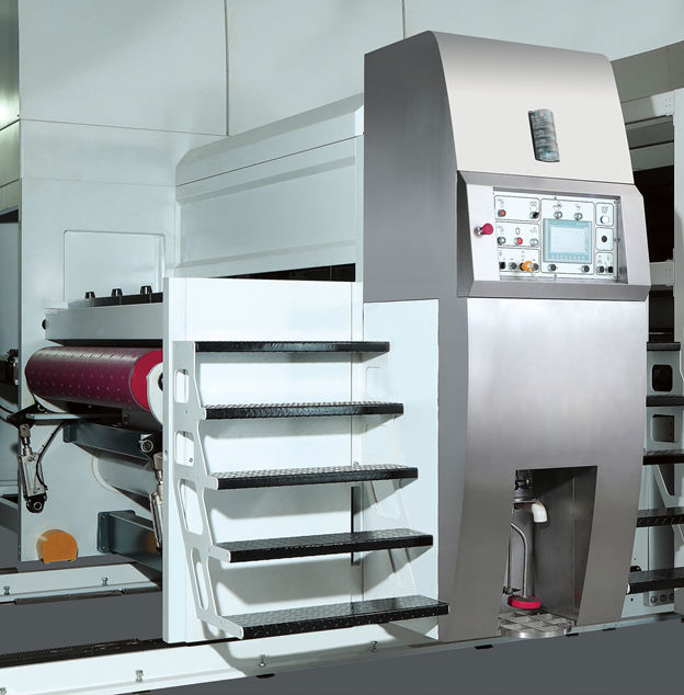 Секция ротационной высечки. Специальное устройство микрошлифования для бандажного вала позволяет сохранить поверхность гладкой. Автоматическая корректировка синхронизирует линейную скорость бандажного вала со скоростью высекального цилиндра (высечной формы).