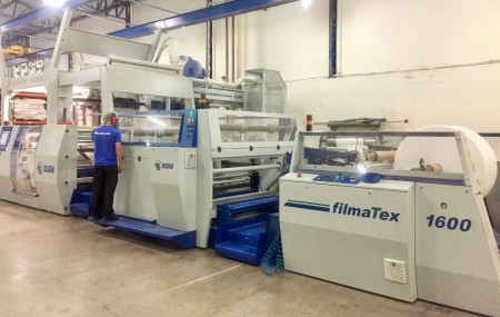 The recent investment in a new ECOTEX1600L including the newest development “VMAX”, which features the capability to change the main fabric roll without stopping and at full production speed, has given a big boost to productivity and quality. Not only does the new feature allow to increase the output of the coating line by up to 5.000 meter per day by gaining meter by meter at time of roll change over conventional machines. Even more important is the constant coating quality. Operators of downstream equipment demand to receive coated fabric only from the new ECOTEX1600L anymore. Reason is the new and so far unknown stability of the coating process. Without the need to reduce line speed the extrusion coating system can continue to run at optimal and constant process conditions. Production stability and ease of operation are far superior compared to other systems on the market thanks to the smooth and jolt-free splicing of fabric ends at speeds of up to 250m/min. As these benefits have been proven after the installation of the ECOTEX1600L further invest decision has been taken by TÊXTIL OESTE: the LAMINEX “retires with honor after 20 years” and will be replaced by yet another ECOTEX CL.