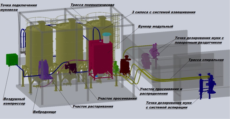 Разработанная система включает 3 (50 куб.м.) с системой взвешивания муки, несколько участков растаривания и просеивания, а также две точки дозирования с системой аспирации и поворотным раздатчиком. Кроме того проект предусматривает создание двух видов трасс для бестарной подачи сырья – спиральную и пневматическую. предназначена для выгрузки муки из муковозов в силоса, а для перемещения сырья внутри производственных цехов.