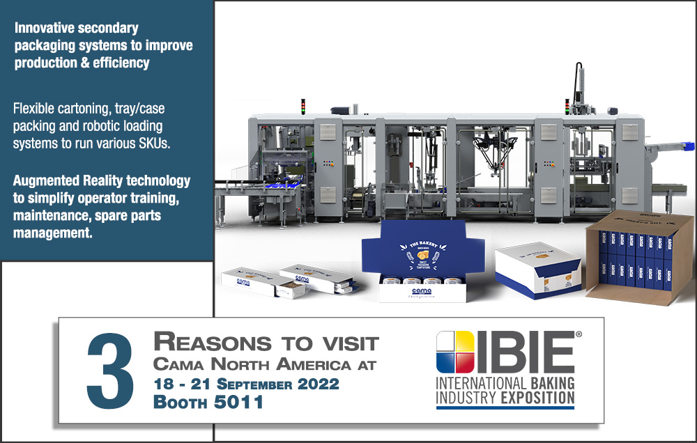 “Because the bakery and snack food market comprise a key part of our business, we’re excited to make our debut exhibit at the IBIE Show this September in Las Vegas,” says Billy Goodman, managing director, Cama North America. “We understand that the bakery industry demands speed, precision and repeatability and our versatile packaging solutions meet those demands, while still offering maximum flexibility and expert handling of delicate products.”