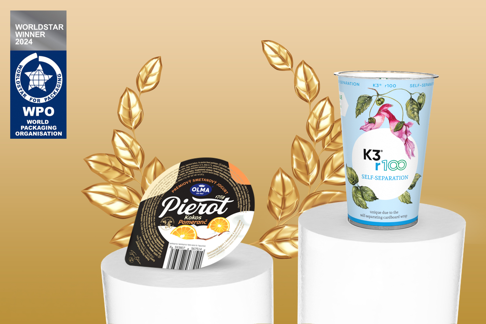 The K3® r100 product innovation has made the impossible possible: The cardboard wrap and plastic packaging separate from each other without human intervention during the waste disposal process. This means that achieving a high recyclability rate (up to 98%) does not depend on proper separation by the end consumer – as with all previous K3® packaging: It happens completely independently. Customers such as the Austrian company Berglandmilch and the Swiss dairy Molkerei Forster already trust in self-separating K3® r100. 2023 Greiner Packaging received the Green Packaging Star Award for its innovation.